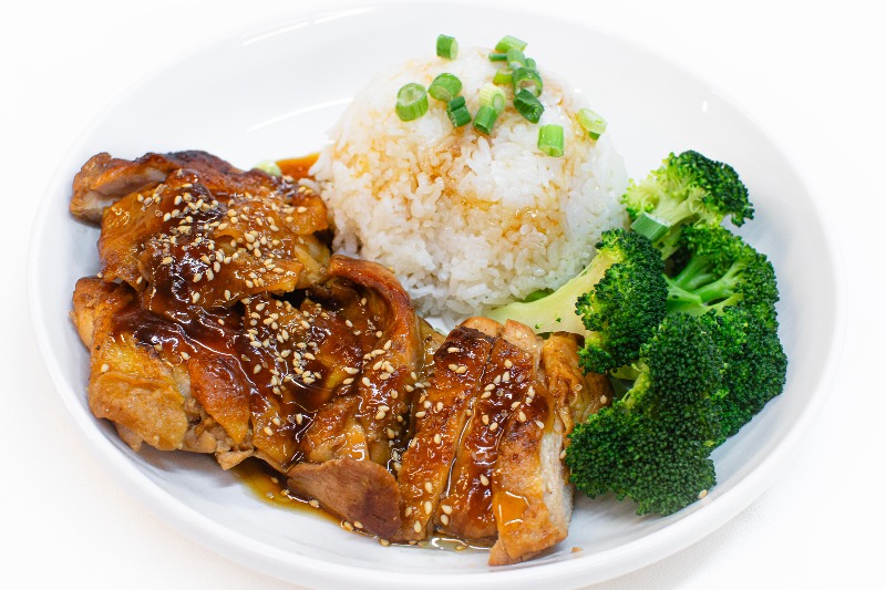 Grilled boneless chicken thigh that is marinated in a homemade sweet and savory teriyaki sauce.Served with steamed broccoli and steamed white rice topping with roasted sesame seeds and scallions.