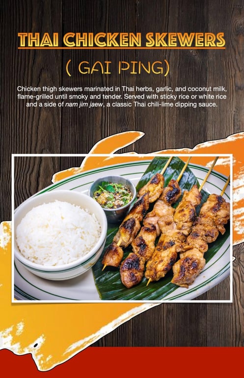 Chicken thigh skewers marinated in Thai herbs, garlic, and coconut milk, flame-grilled until smoky and tender. Served with a side of nam jim jaew, a classic Thai chili-lime dipping sauce.