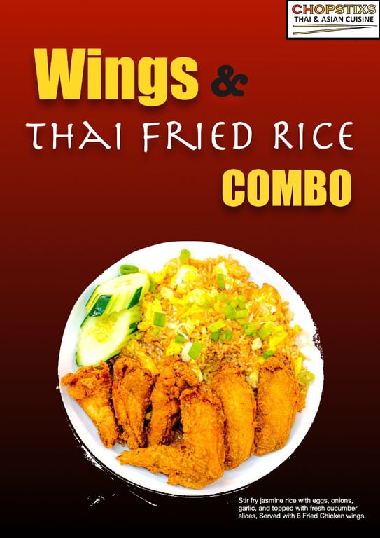 Order online for delivery and takeout: R4. Thai fried Rice w Wings Combo from Chopstixs Thai & Asian Cuisine. Serving the best Thai & Chinese Food Restaurant,Fort Bragg Delivery in Spring Lake, NC.