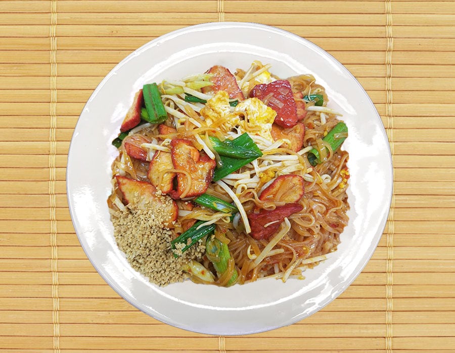 Thin rice noodles stick with bean sprouts, red onions, green onions and eggs in pad Thai sauce(Fish Sauce, Lime juice, Sugar) topped with ground peanuts.