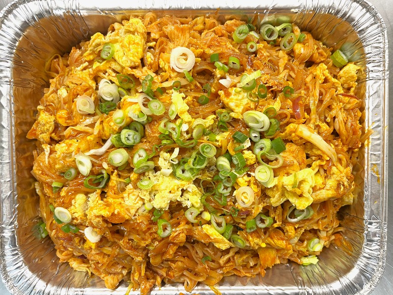 Thin rice noodles stick with bean sprouts, red onions, green onions, and eggs in pad Thai sauce topped with ground peanuts. Size 9in L x 6.5 in W x 2.75 in H [This item requires 20 minutes to prepare.]